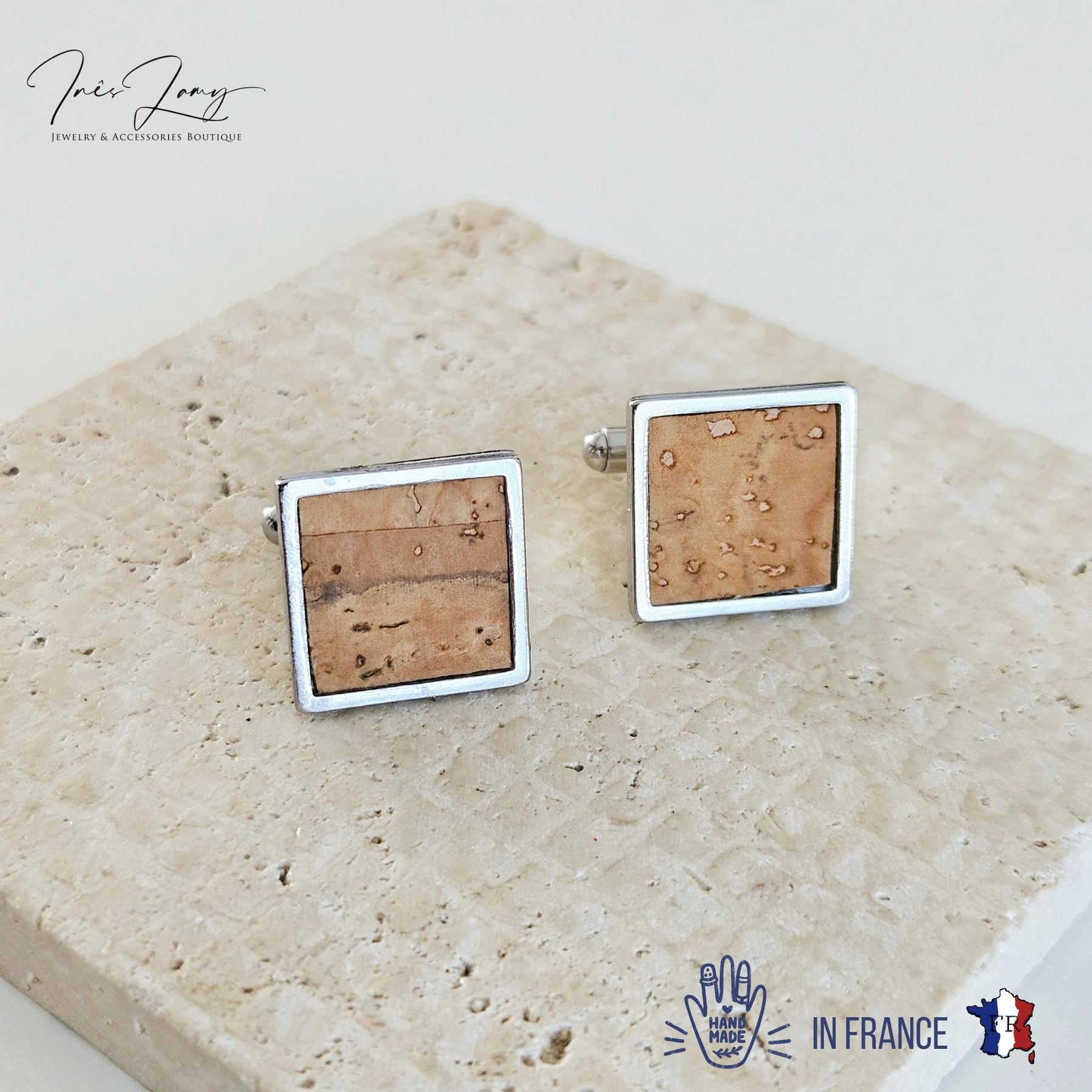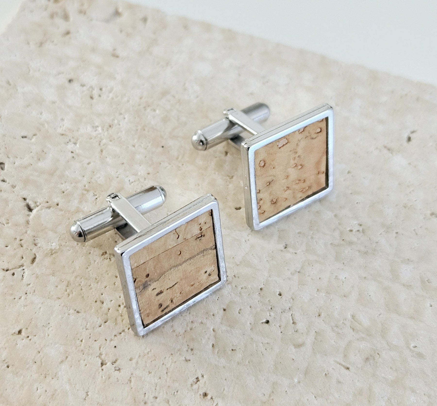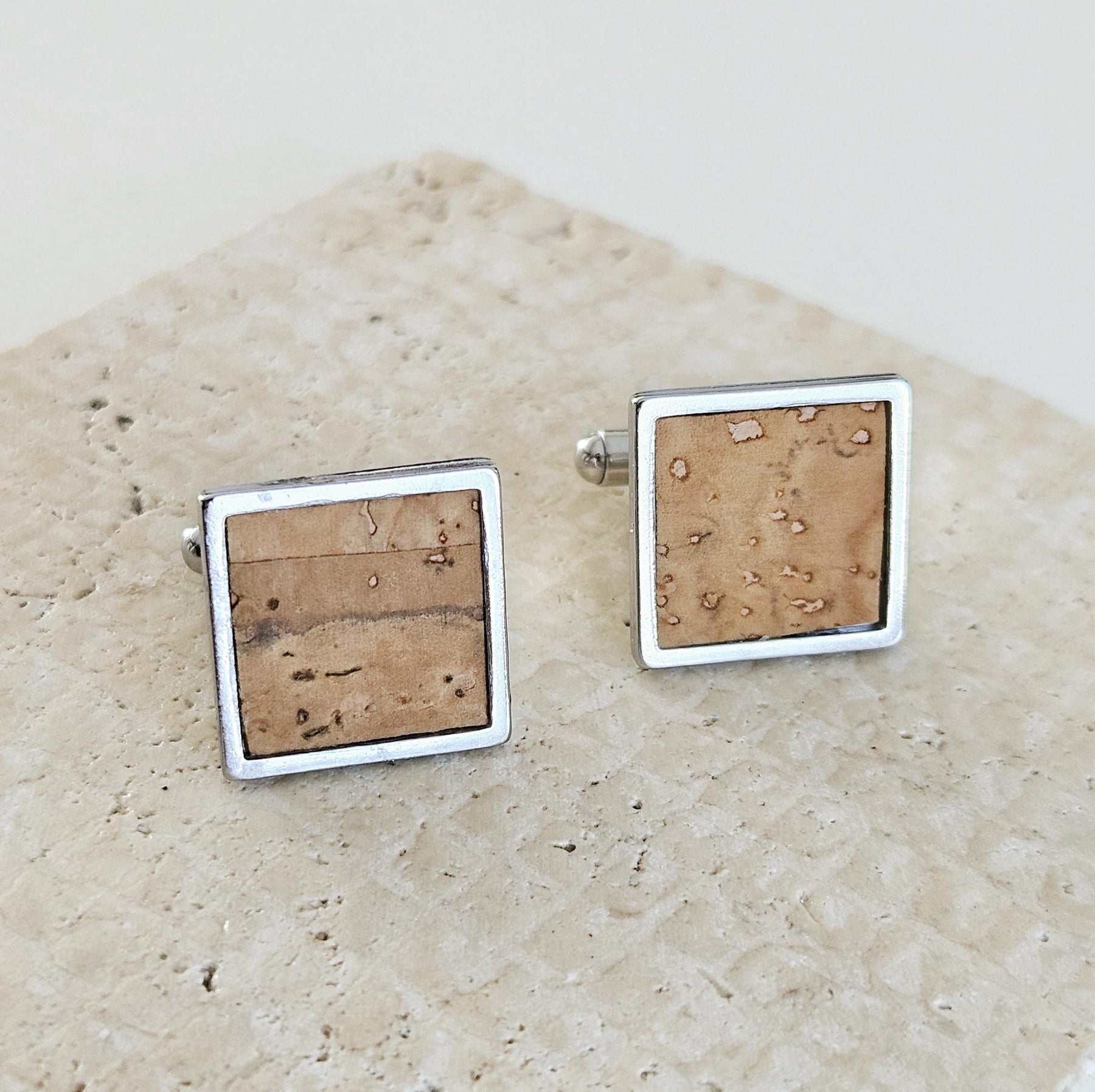 These cork cuff links are made with cork. Handmade and finished with a stainless steel cufflink base.