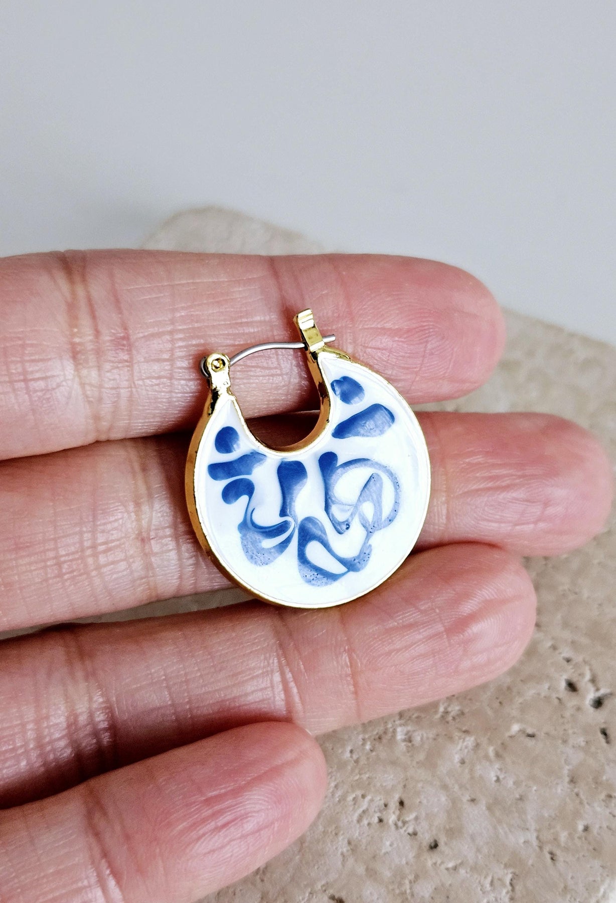 Handcrafted hoop earrings in a gold plated base, inlay with enamel white and blue wavy patterns, inspired by the ocean that surrounds Portugal and the Mediterranean Sea, that goes along with Meditteranean countries, like Italy, Spain, or Greece.