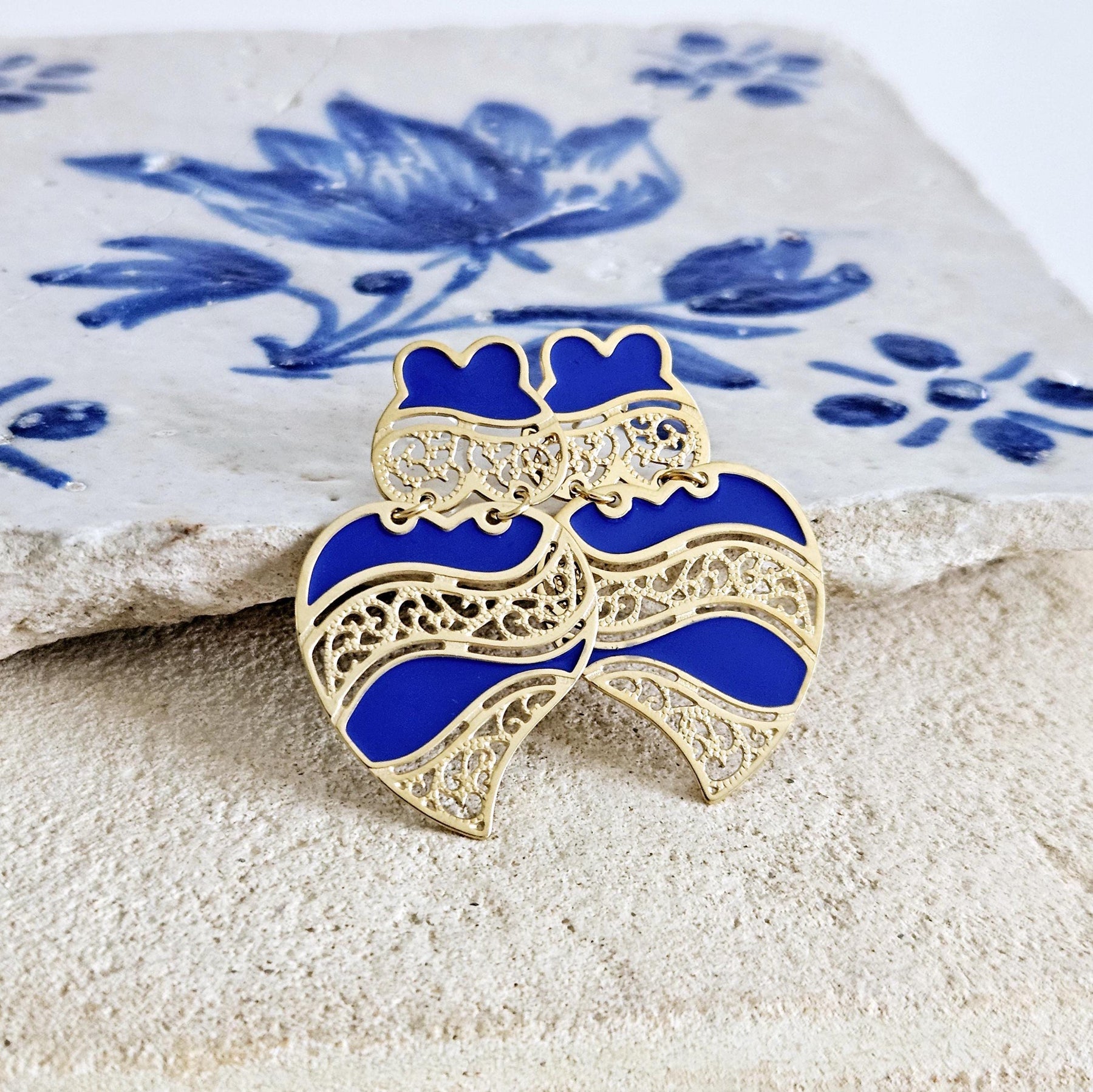 Viana heart earrings (Viana do Castelo - the city from Portugal where the origin of this heart shape was created), featuring a filigree work in gold steel, thin and lightweight stud drop earrings, nickel and lead free, made in an intricate detail, with blue enamel, which reminds the blue typical tiles from the past.