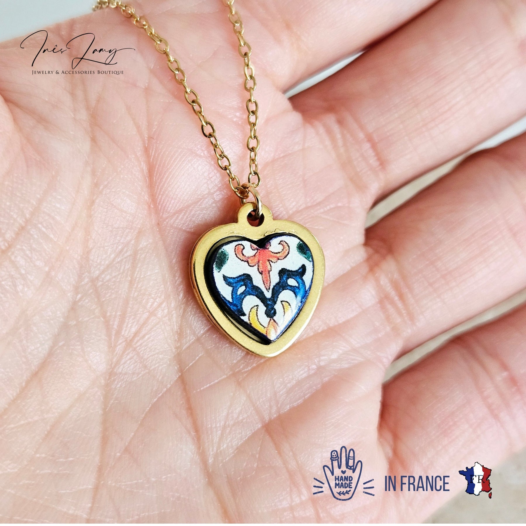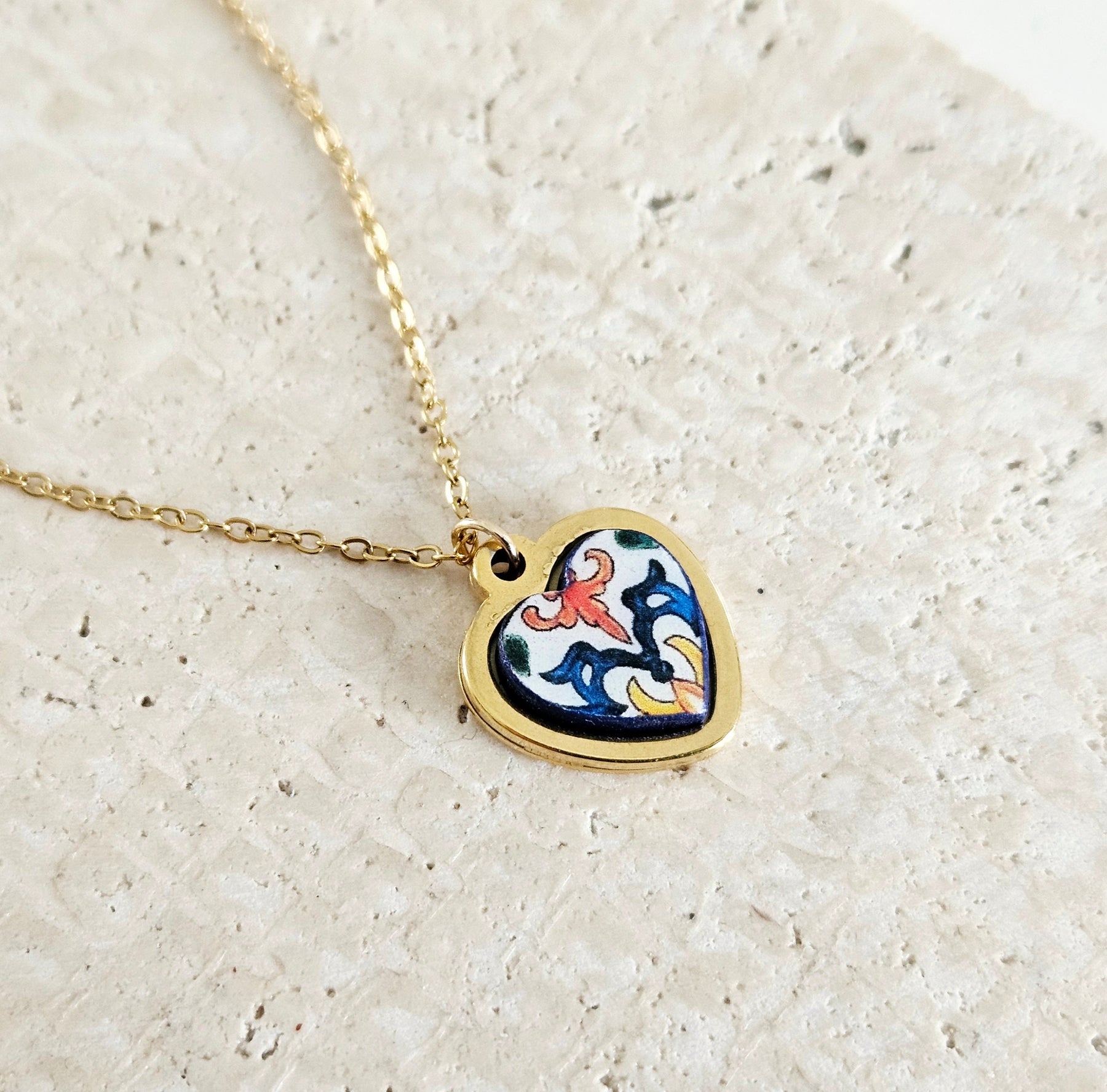Portuguese heart shaped tile on a gold necklace, handmade with stainless steel heart base and a colorful Portuguese mini tile of 12 mm (or half an inch) heart size wood tile, hand finished and varnished for protection and long lasting wear.