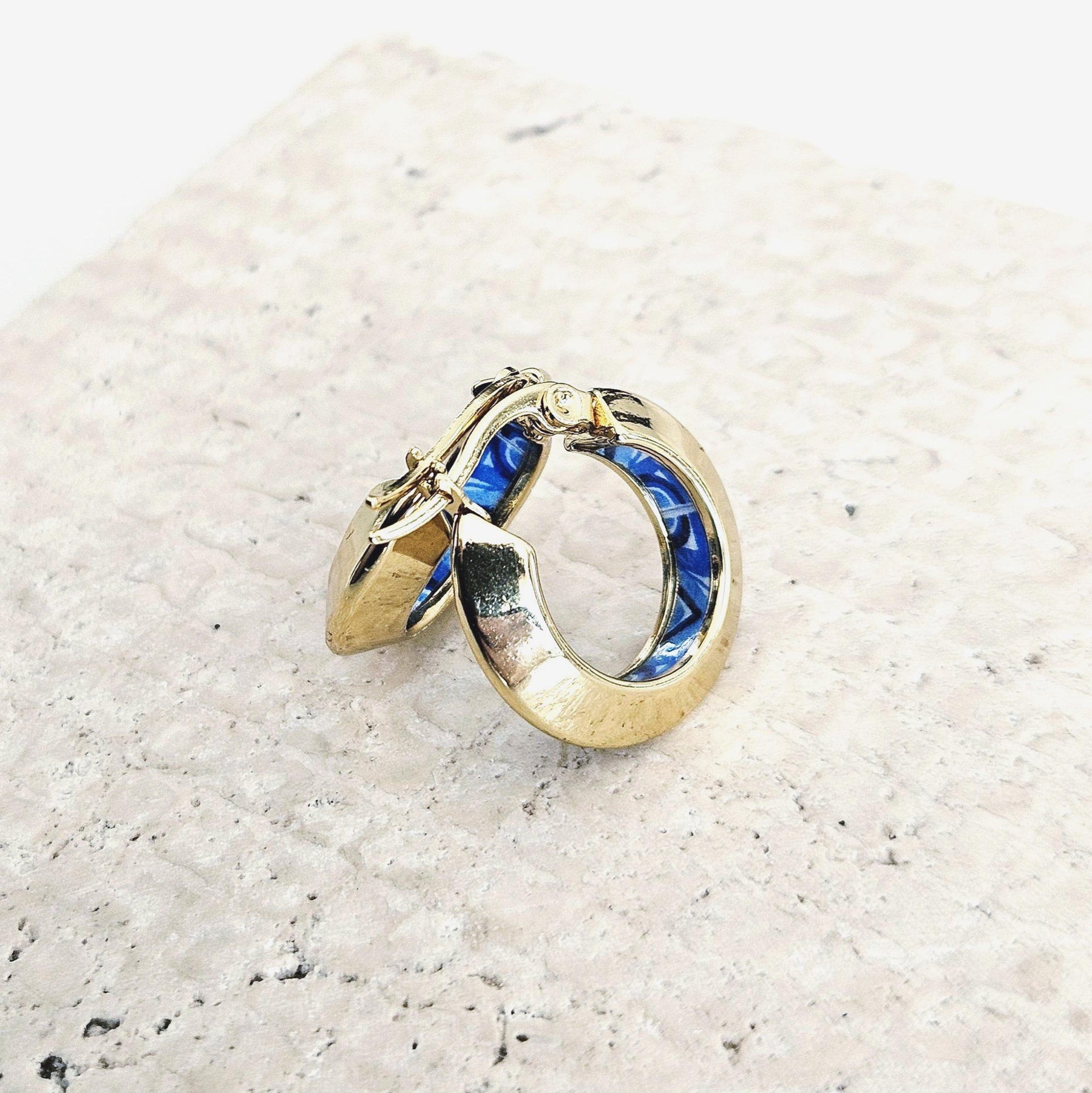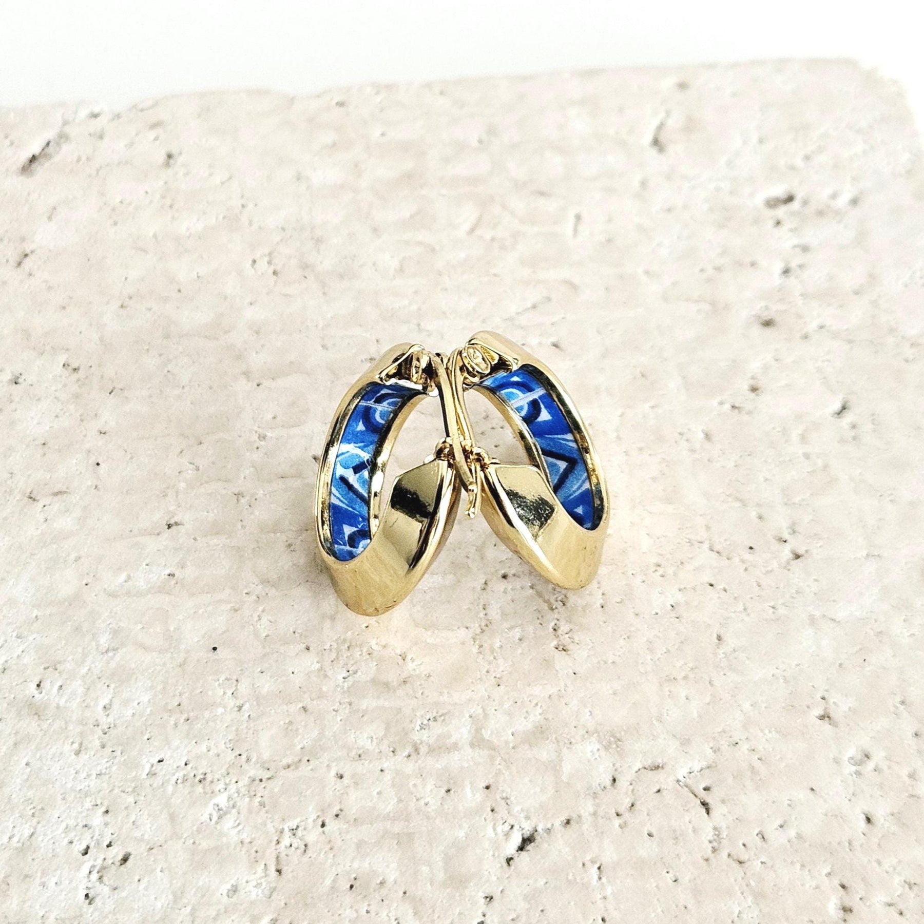 Blue inlay Portuguese typical tiles patterned earrings, on a disc hoop earrings in gold stainless steel, lightweight, but definately a statement piece.