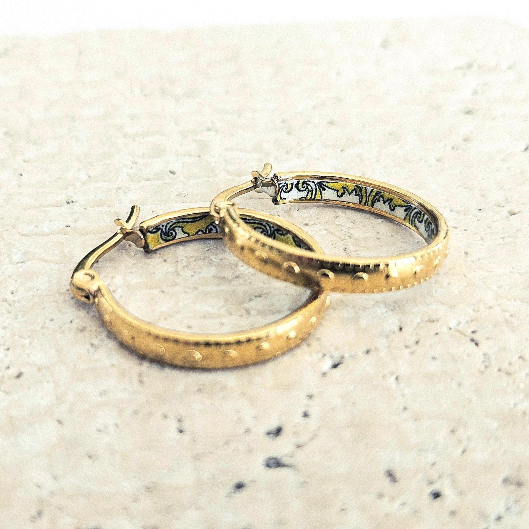 Portuguese tile pattern earrings, handmade with an outside etched effect in the hoop Earrings, in gold stainless steel finish