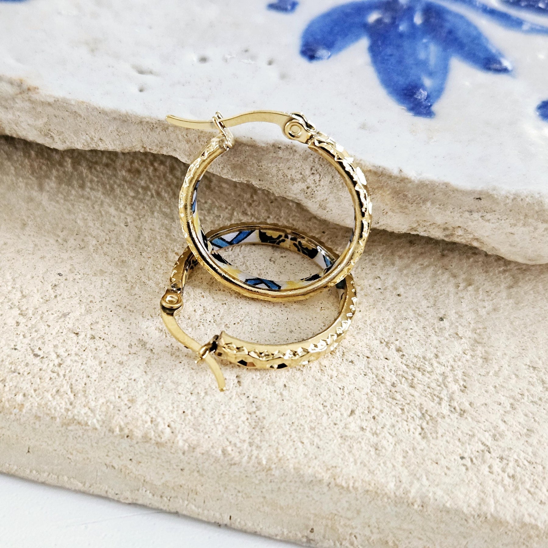 Portuguese tile pattern earrings, handmade with an outside etched effect in the hoop Earrings, in gold stainless steel finish