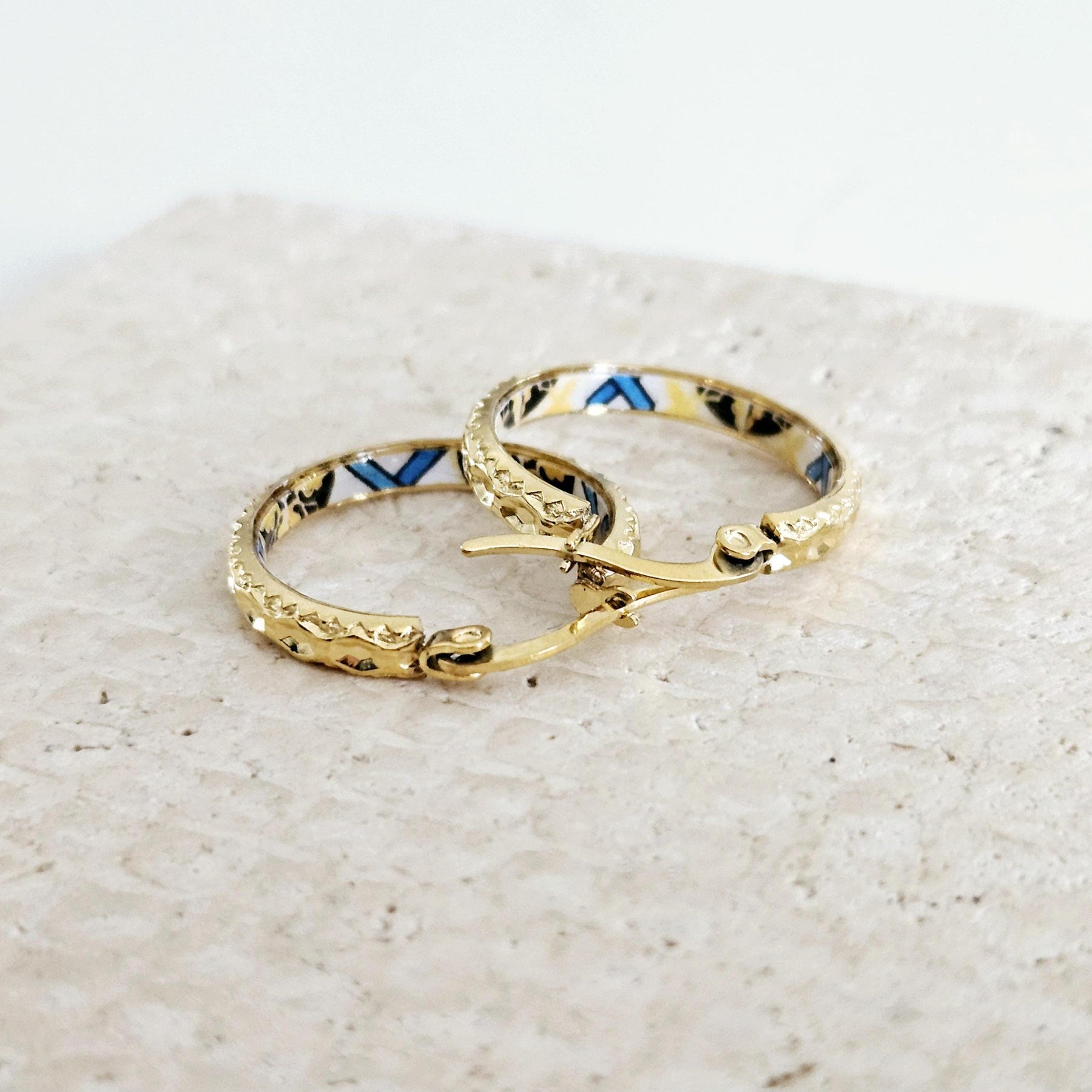 GOLD Etched Hoop Earrings Yellow Blue Inlay Tile Hoop Portuguese Tile Jewelry Anniversary Birthday Gift for Women Stainless Steel 22mm|0.9"