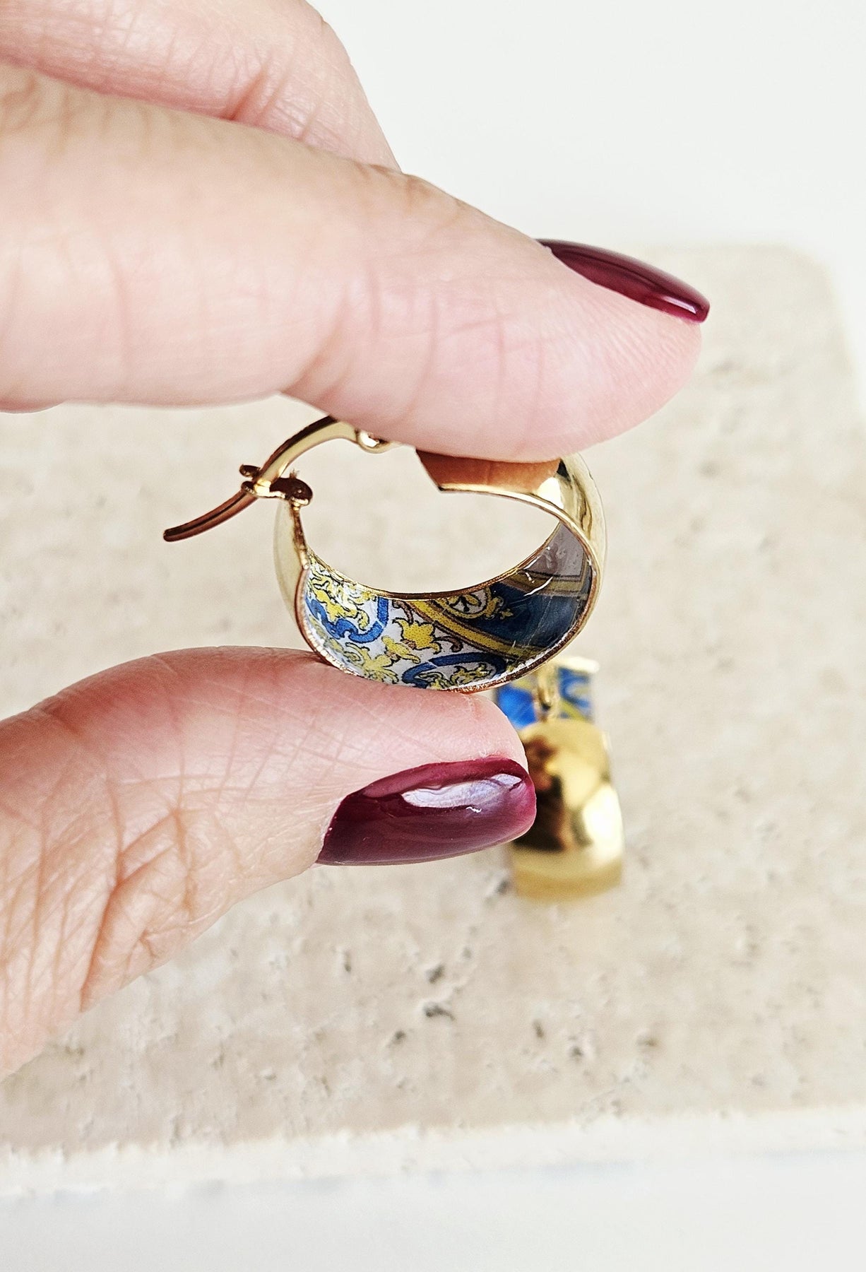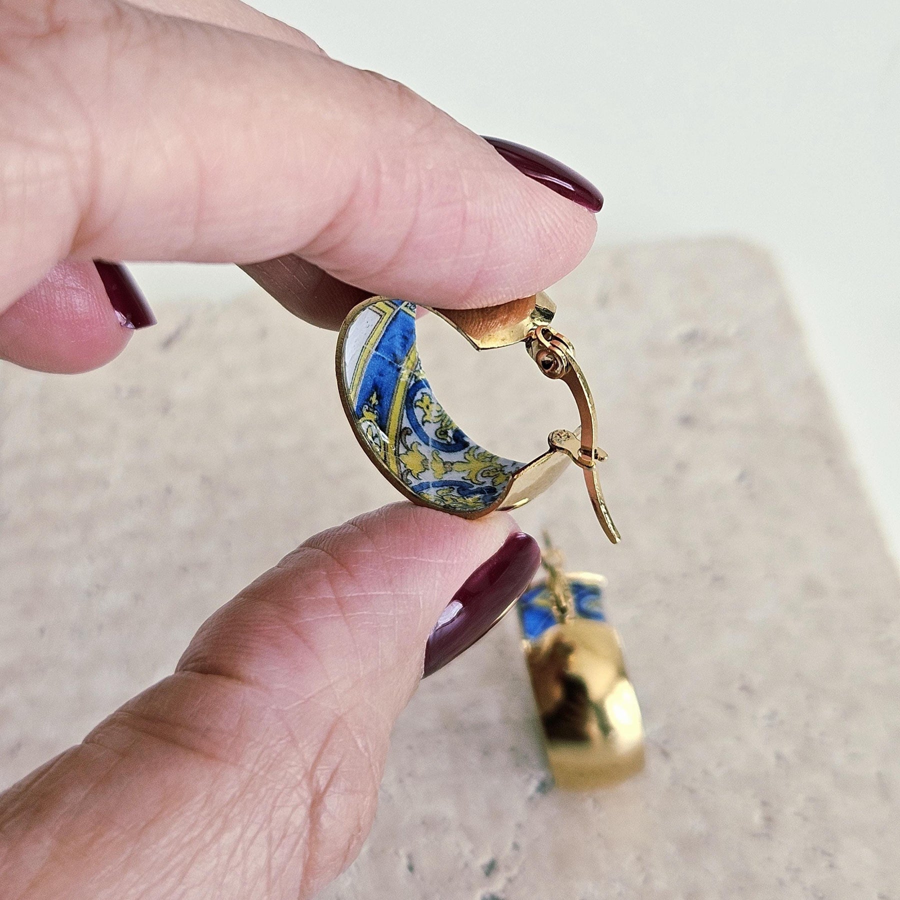 These hoop earrings are made with Portuguese typical tiles from the 18th century, that makes a beautiful tile jewelry gift suggestion, for anniversaries, birthday's, mother's day, Christmas gift giving or any other special occasion.