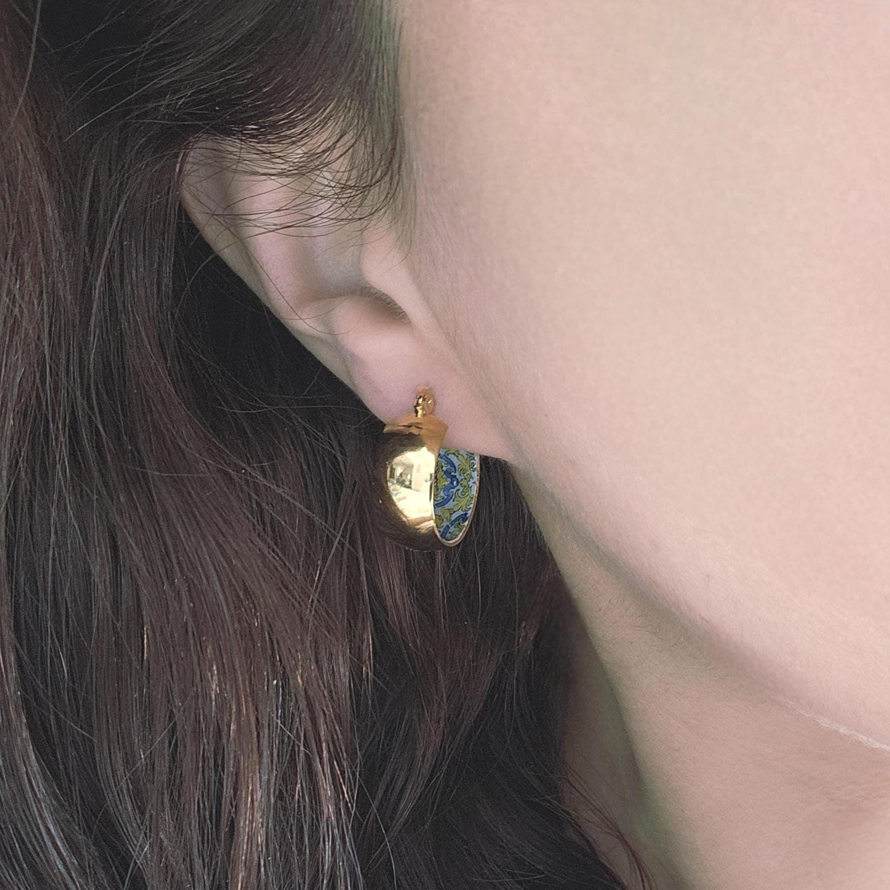 Blue inlay Portuguese typical tiles patterned earrings, on large hoop earrings in gold stainless steel, lightweight, but definately being a statement piece.
