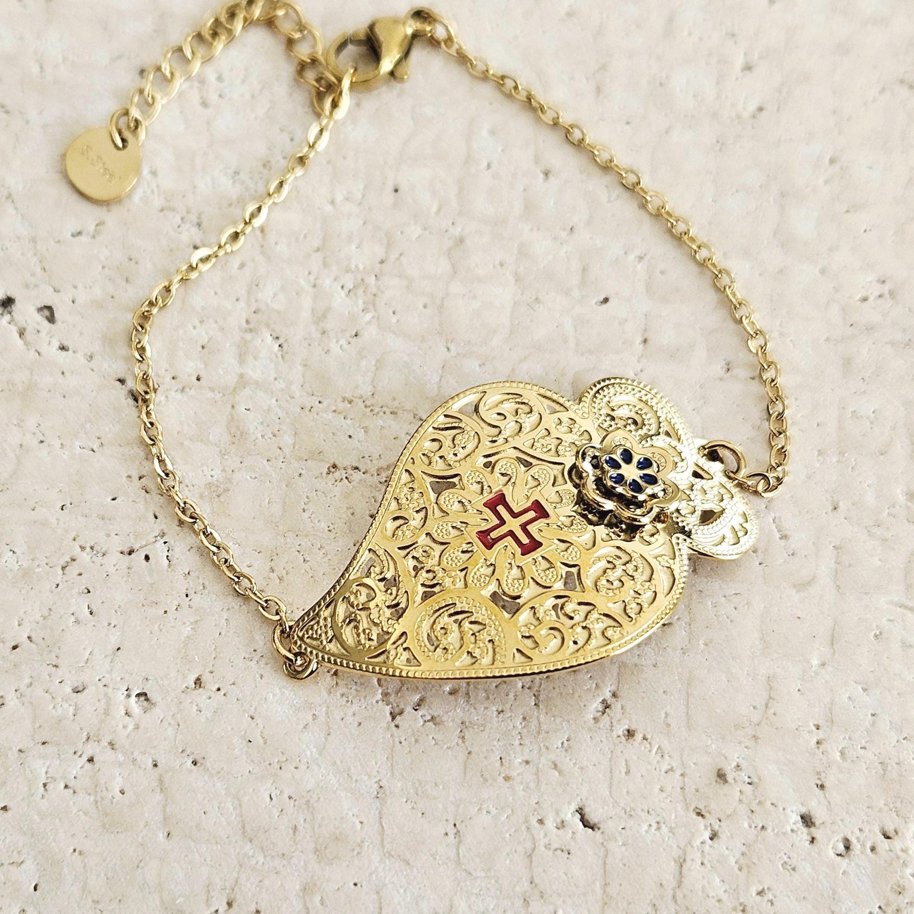 Portuguese Heart GOLD STEEL Bracelet Curved Heart of Viana Filigree Bracelet Mom Handmade Birthday Gift Dainty Adjustable Chain Bracelet