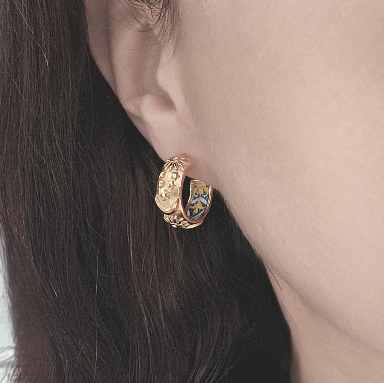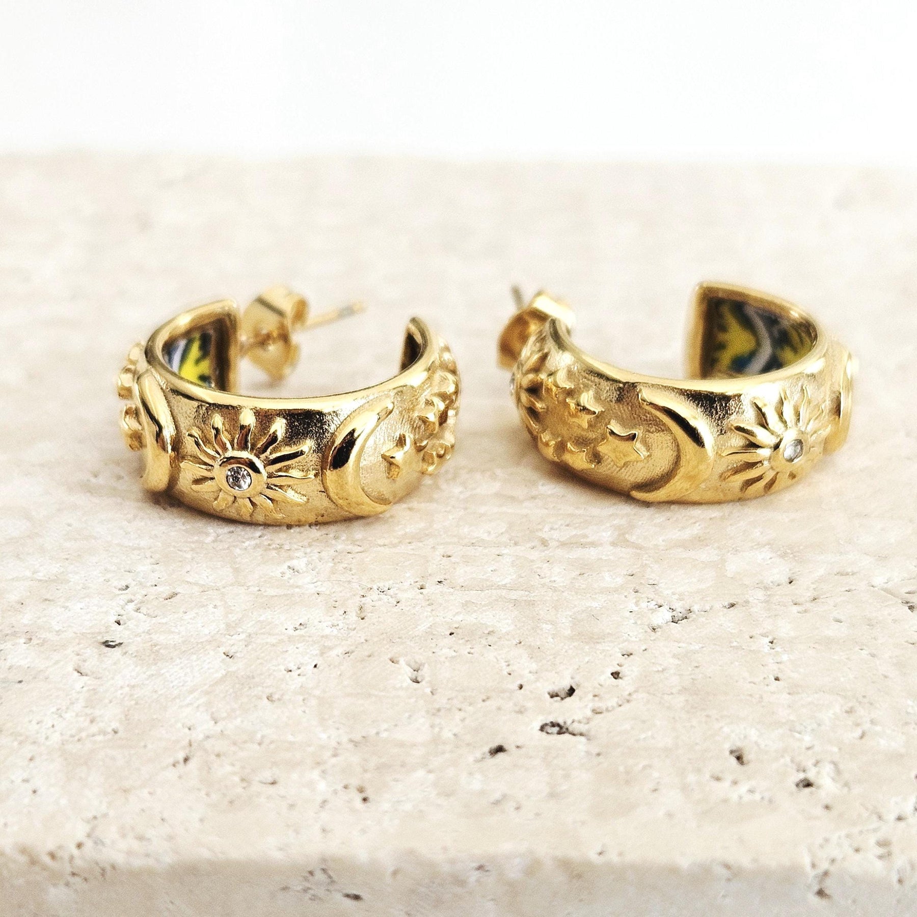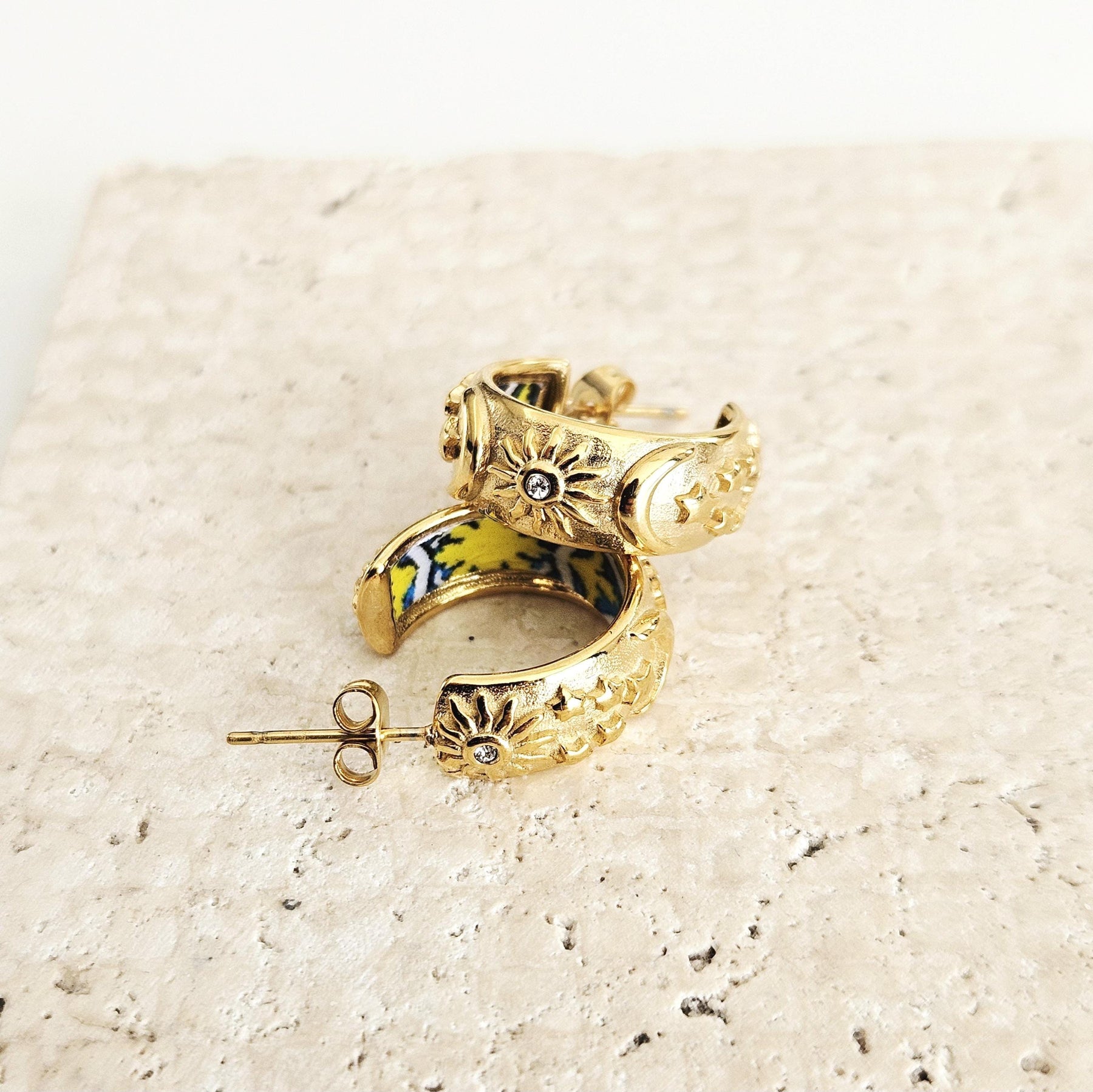GOLD Large Hoop BLUE Yellow Tile STEEL Earring Azulejo Inlay Portuguese Blue Tile Hoop Sun Moon Stars Gold Etched Hoop Women Gift 2cm|0.78&