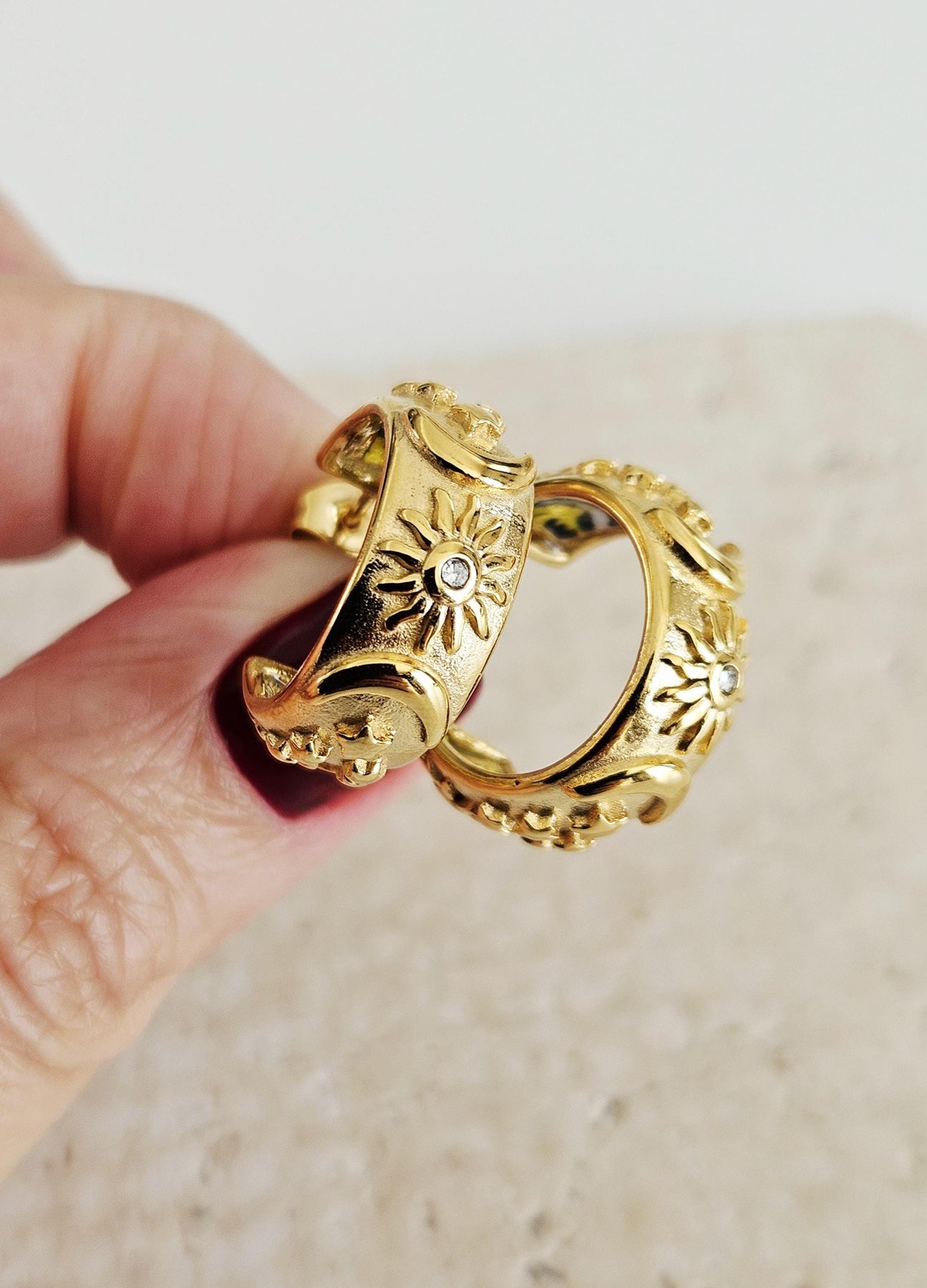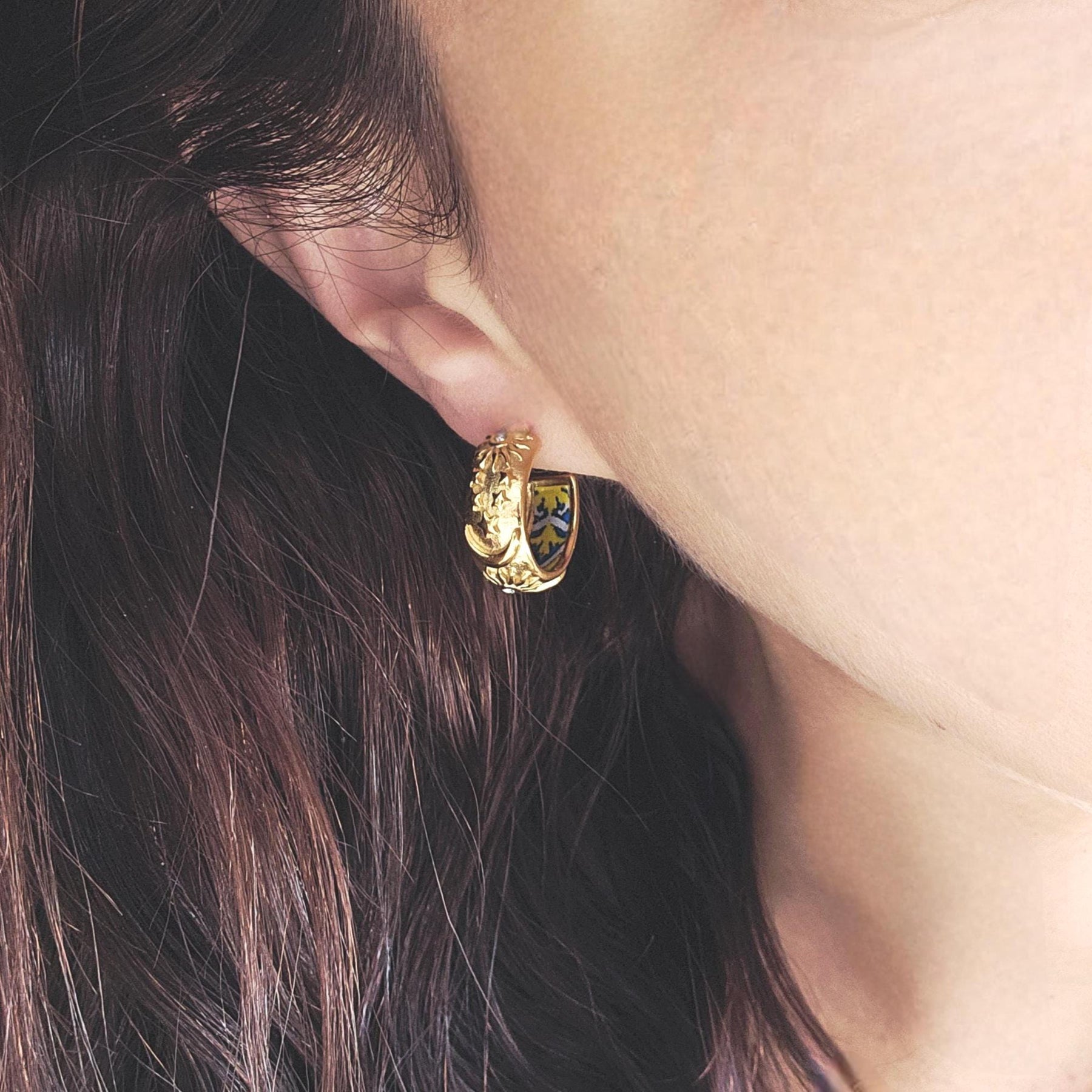 Blue and yellow tile patter inlay of Portuguese antique tiles, on large hoop earrings in gold stainless steel, and etched moon, stars and sun incised cut, lightweight, but definately being a statement piece. Little incrusted crystals are included in the "sun" parts.